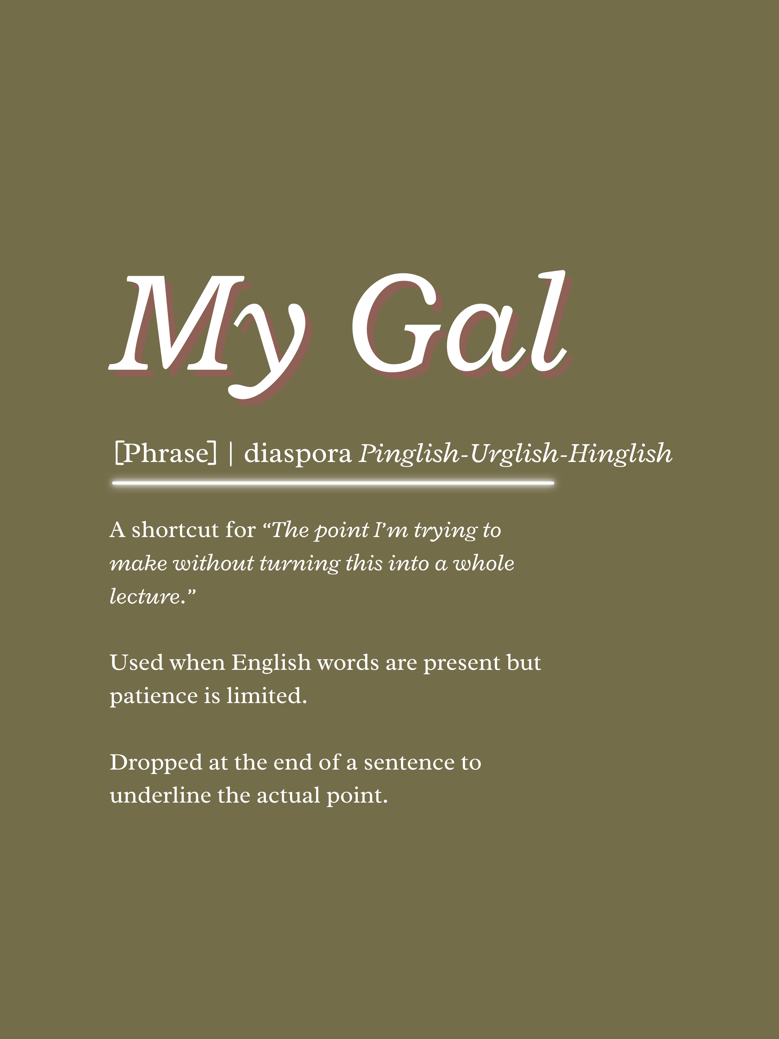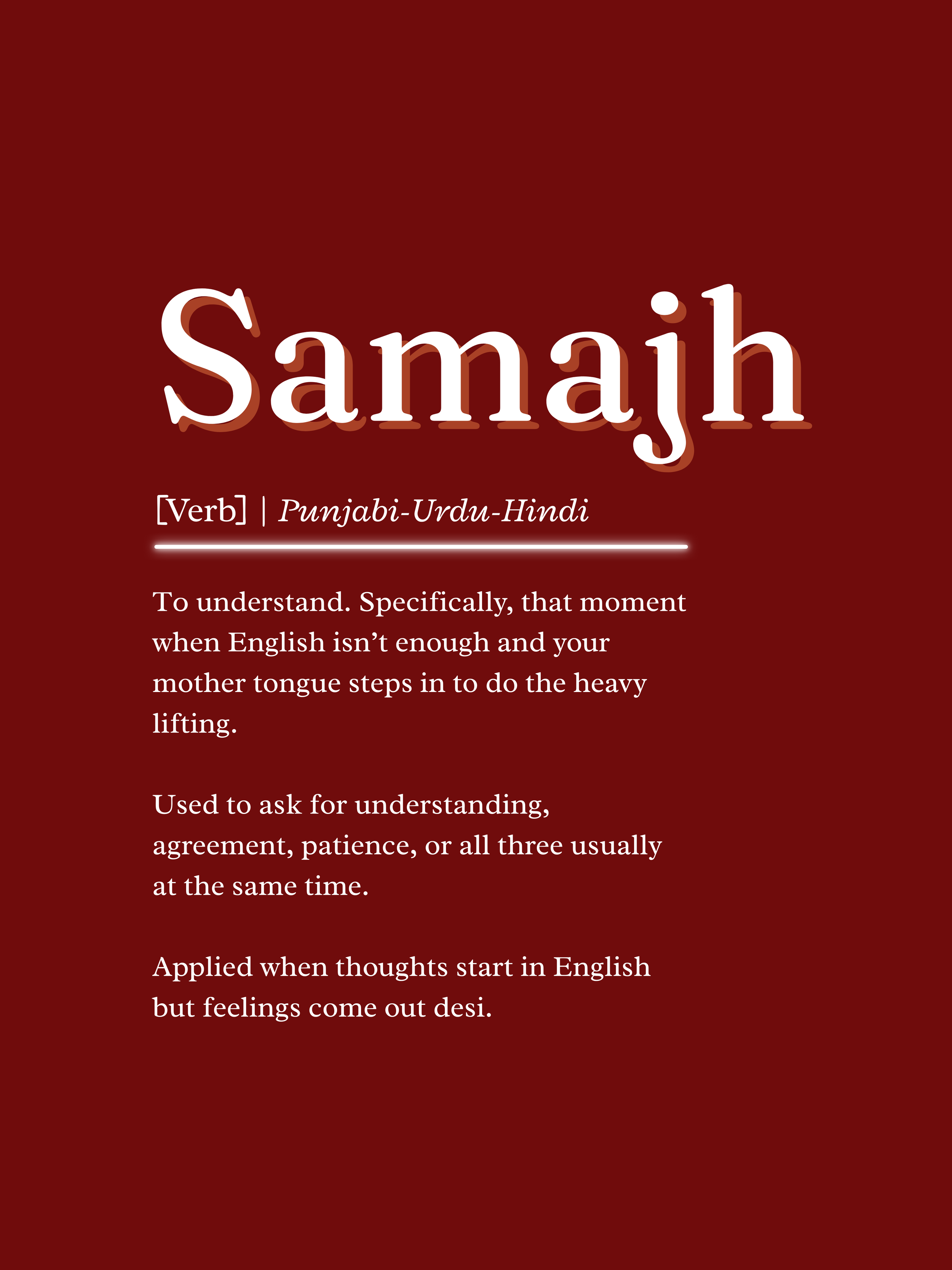 Samajh My Gal roughly means to “understand my point”, but it’s more than translation. It’s what happens when English isn’t enough and your mother tongue steps in.